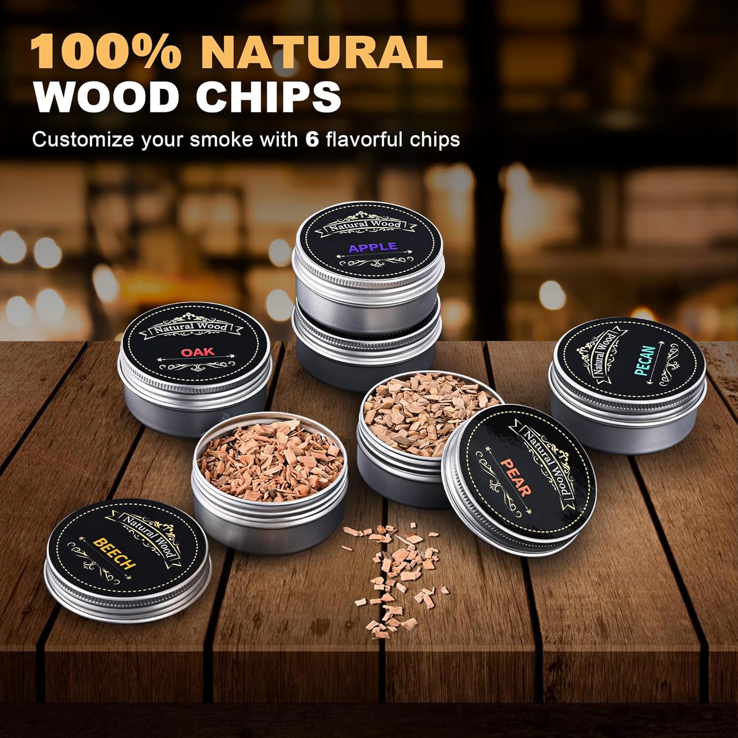 - 6 Gourmet Wood Chips for Signature Flavor Mastery:Unlock 6 distinct flavor profiles with included premium wood chips: pear (fragrant), applewood (sweet), cherry (fruity), beech (earthy), pecan (nutty), and oak (vanilla notes). Each pouch enhances bourbon, cocktails, or smoked dishes with restaurant-quality depth—perfect for crafting a smoky old fashioned smoker kit experience or experimenting with new recipes