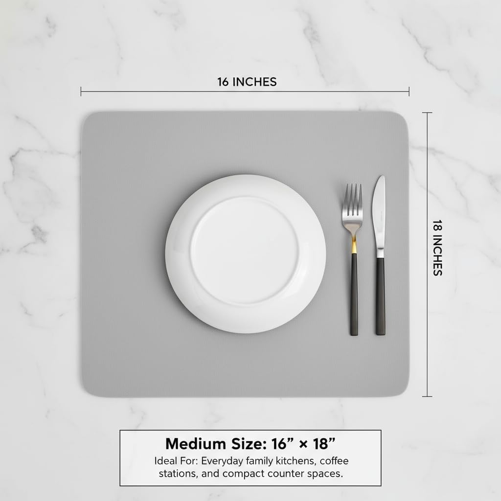 Dish Drying Mat Super Absorbent – 16" x 18" Coffee Mat for Countertops – Non-Slip Drying Mat for Kitchen Counter – Easy to Clean Water Absorbent Mat – Large Dish Drying Mats (Lite Gray)