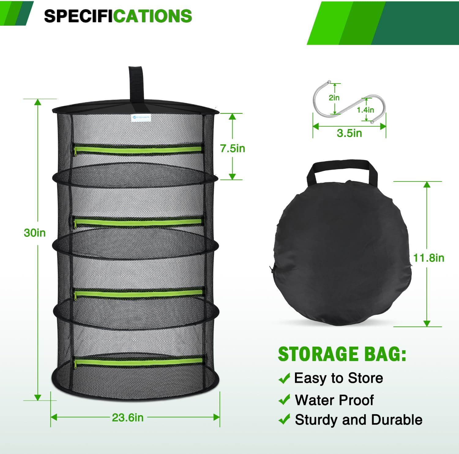 - AVAILABLE IN VARIOUS SIZES: The herb dryer hanging rack is available in 4-layer, 6-layer, 8-layer and 3 colors. This plant drying rack is 4-layer, 23.6" in diameter, each grid is 7.5" high, and 30" in total height when unfolded, fits 2x2 or Larger Grow Tents. The multi-layer separated drying net ensures optimal airflow between the trays, thereby achieving faster and more even drying. It provides ample space for flower buds and food to meet all your drying needs. Due to the elasticity of the mesh, slight size variations may occur