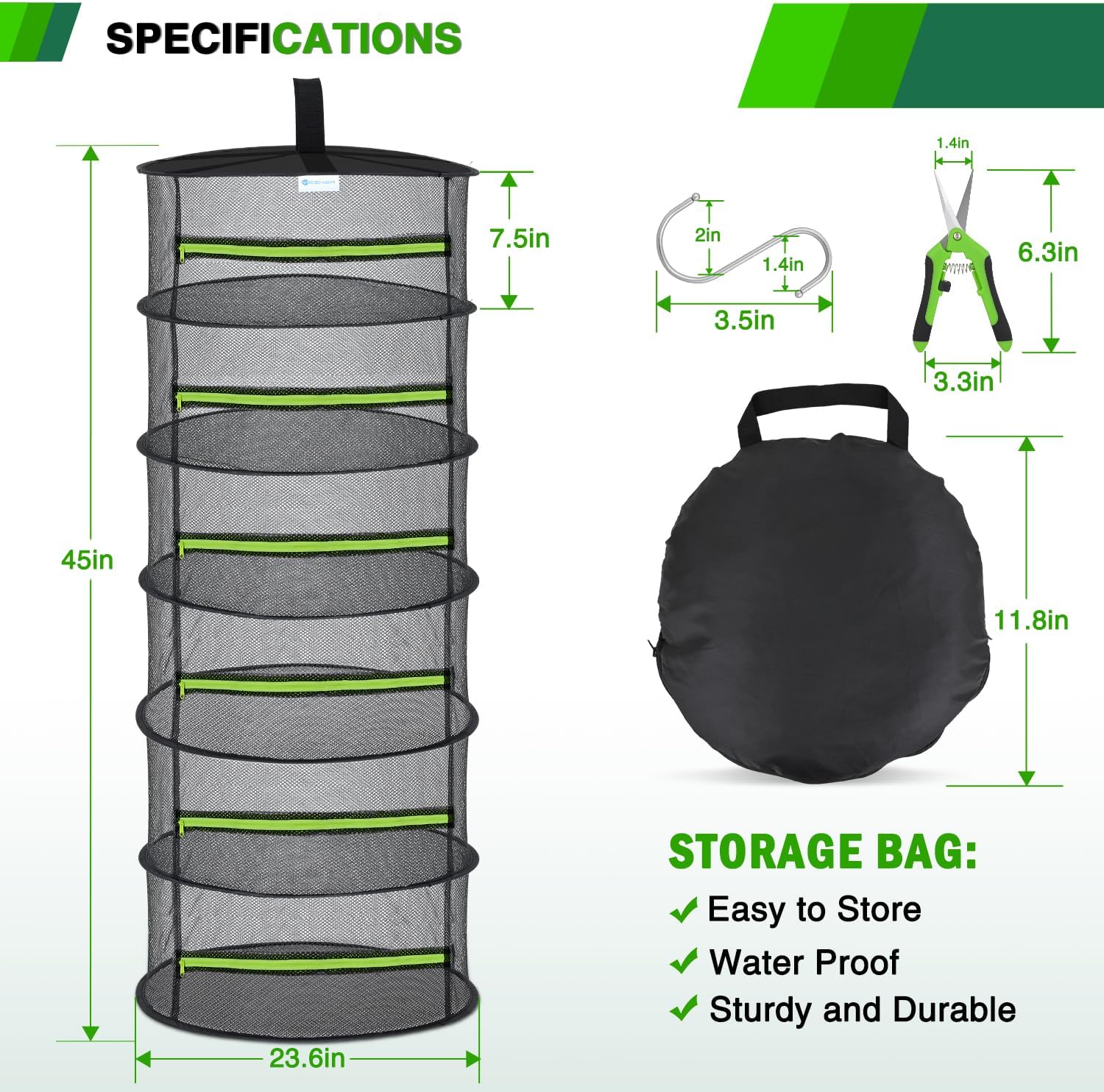 - AVAILABLE IN VARIOUS SIZES: The herb dryer hanging rack is available in 4-layer, 6-layer, 8-layer and 3 colors. This plant drying rack is 6-layer, 23.6" in diameter, each grid is 7.5" high, and 45" in total height when unfolded, fits 3x3 or Larger Grow Tents. The multi-layer separated drying net ensures optimal airflow between the trays, thereby achieving faster and more even drying. It provides ample space for flower buds and food to meet all your drying needs. Due to the elasticity of the mesh, slight size variations may occur