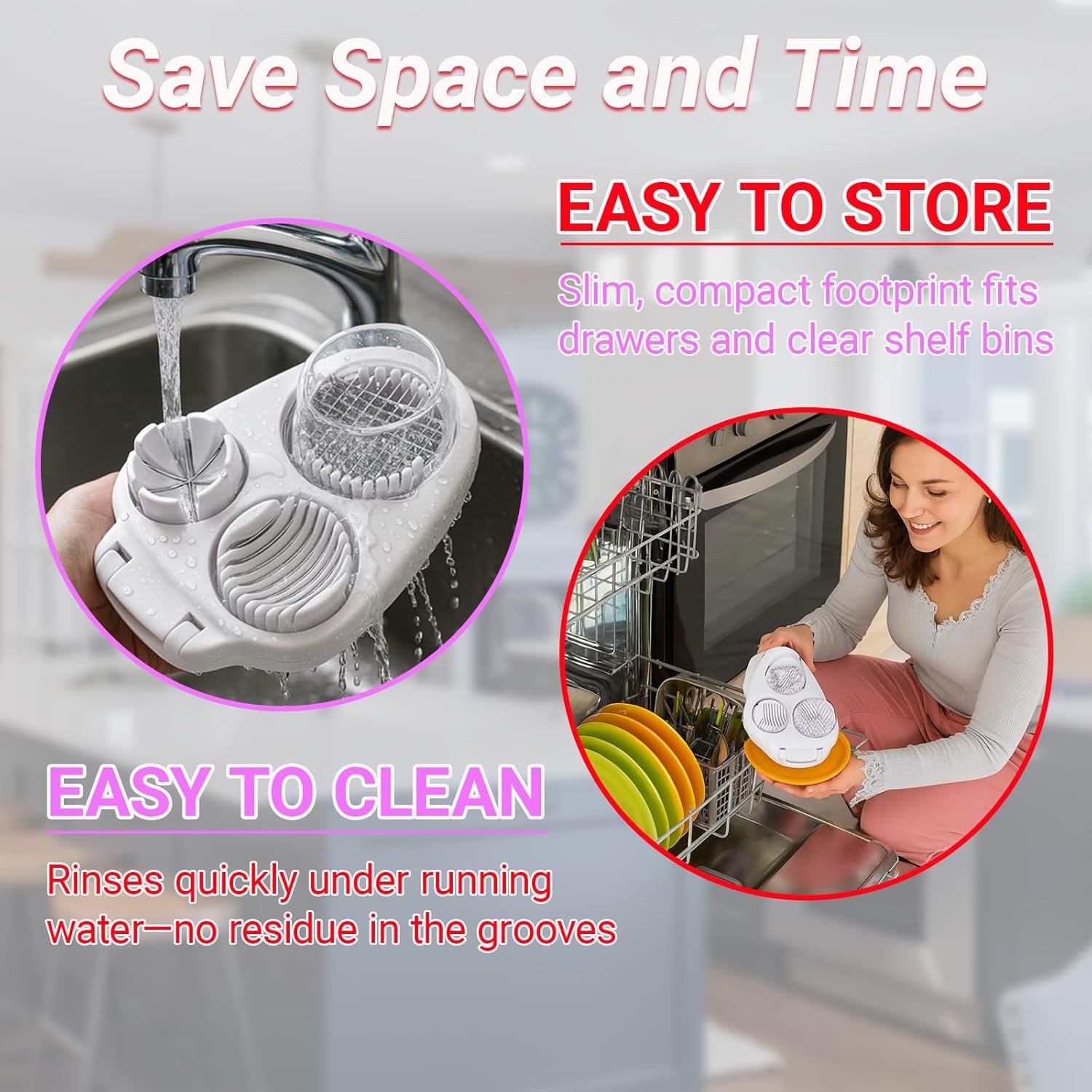 - 【Easy to clean and store】 Smooth surfaces rinse quickly under water or go in the dishwasher, and the compact footprint fits standard kitchen drawers, keeping this 3 in one egg slicer ready for everyday cooking and snack making