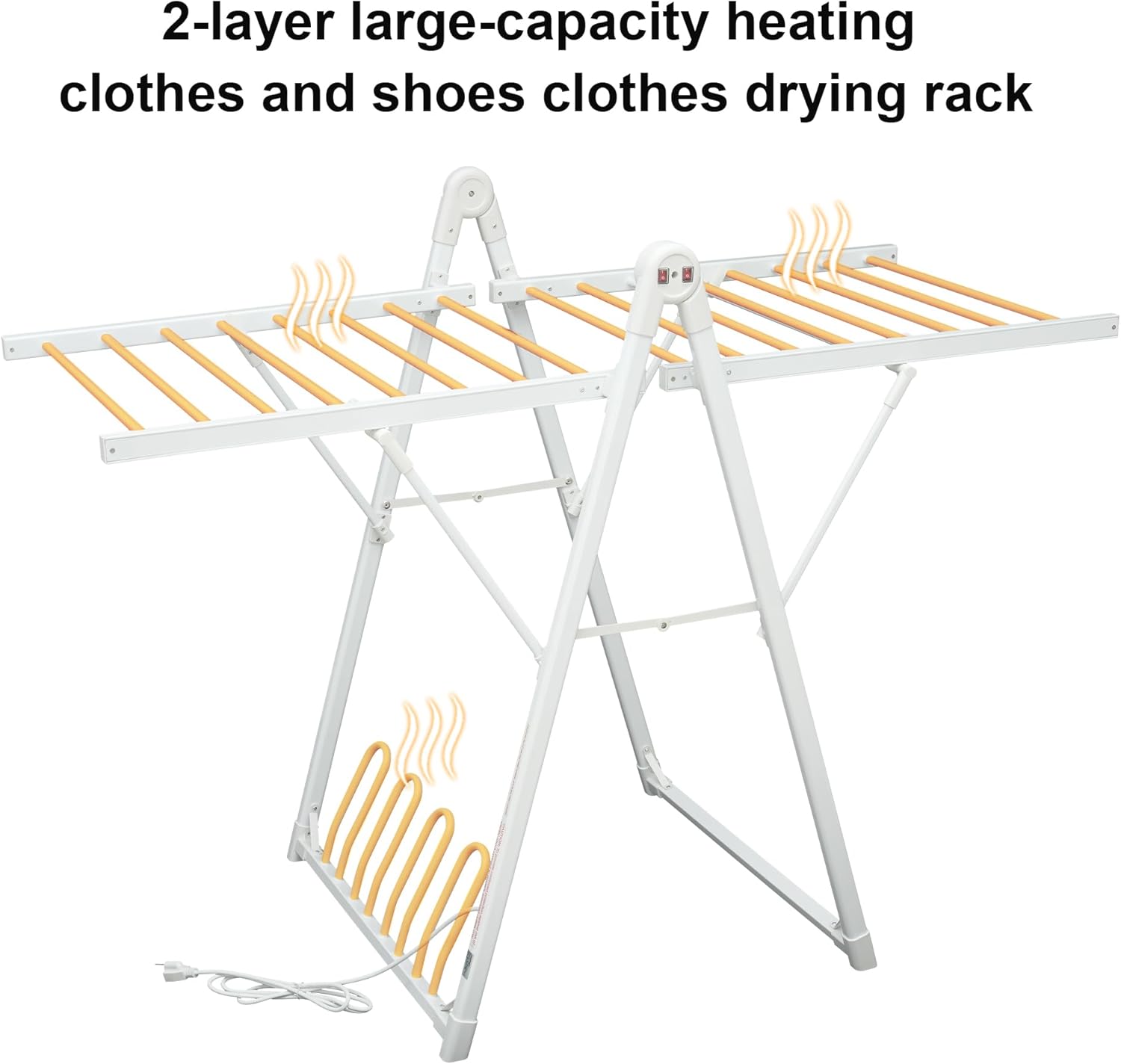 - 【2-Tier Large Capacity & All-in-One Drying】 SHARNDY electric heated drying rack features 2 pacious tiers to efficiently dry clothes, bulky towels, and even shoes simultaneously. It's your ultimate foldable clothes dryer solution for all household laundry needs, eliminating the wait for sunny days.