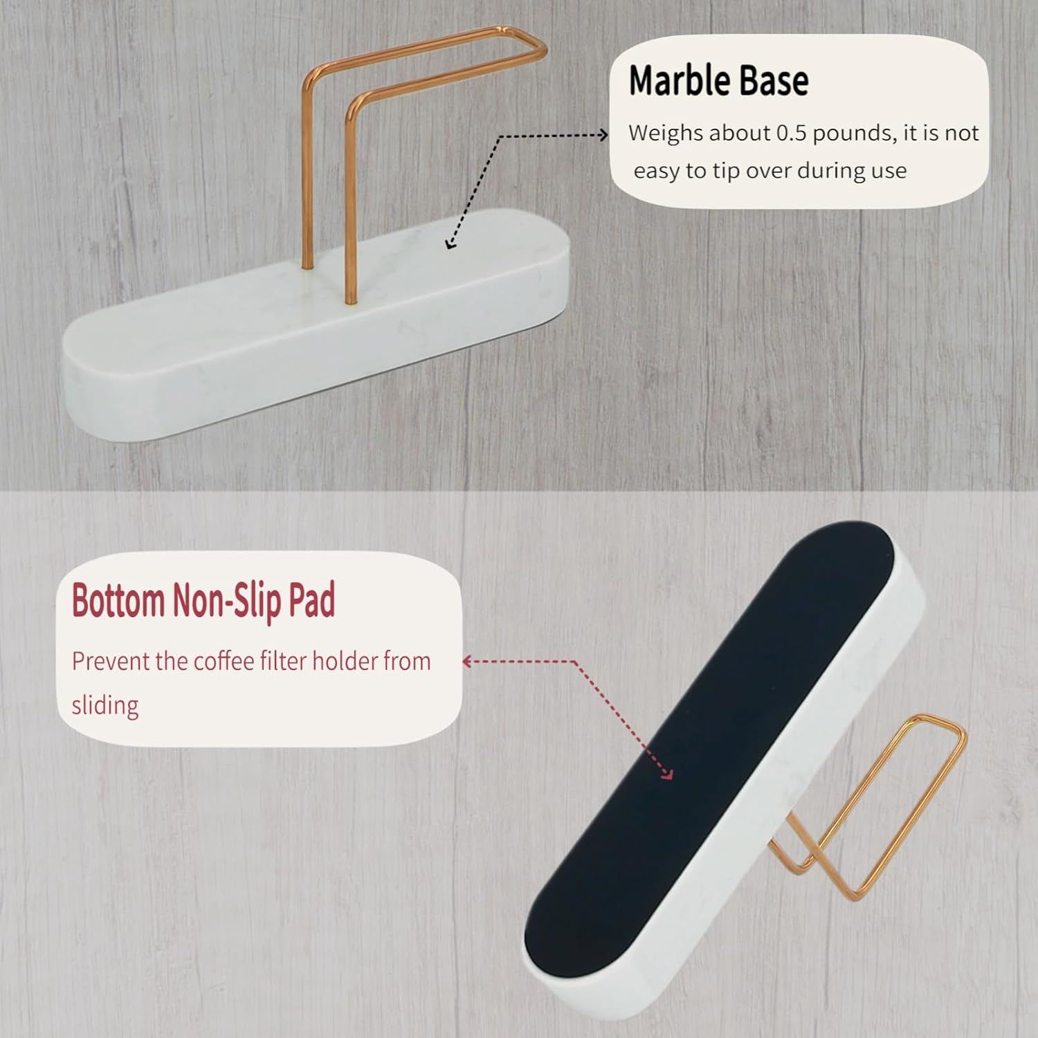 - Material: Marble base and weighs about 0.5 pounds, making the coffee filter holders for counter less likely to tip over
