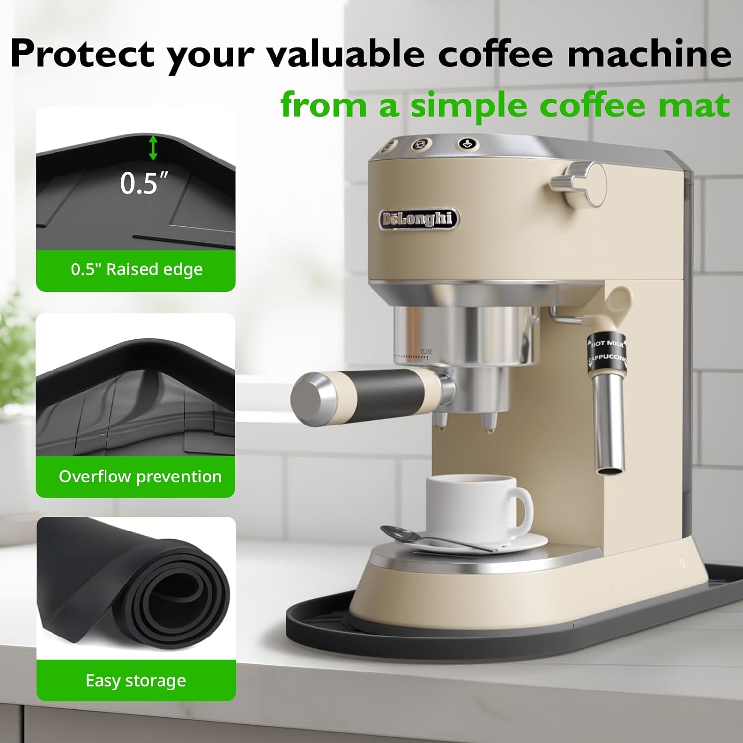 Silicone Coffee Mat,15.8"x 11.8"in Bar Mat for Countertop,Heat-Resistant,Non-Slip,Leak-Proof,Fit for Coffee Maker/Espresso Machine-Black