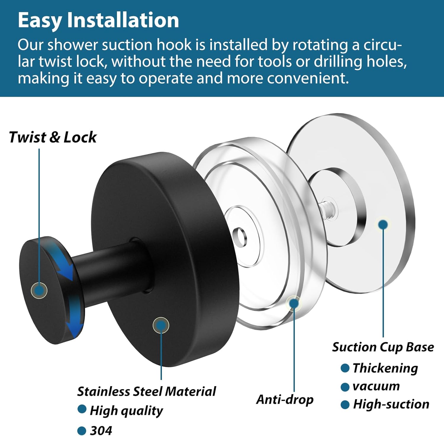 - 【No Screws Required & Reusable】 The stylish shower suction cup hook is made of waterproof and rust-proof 304 stainless steel material, and the excellent vacuum suction technology allows you to easily install and remove without tools or screws. Pry it out with a knife, clean the bottom of the suction cup and dry it for reuse.